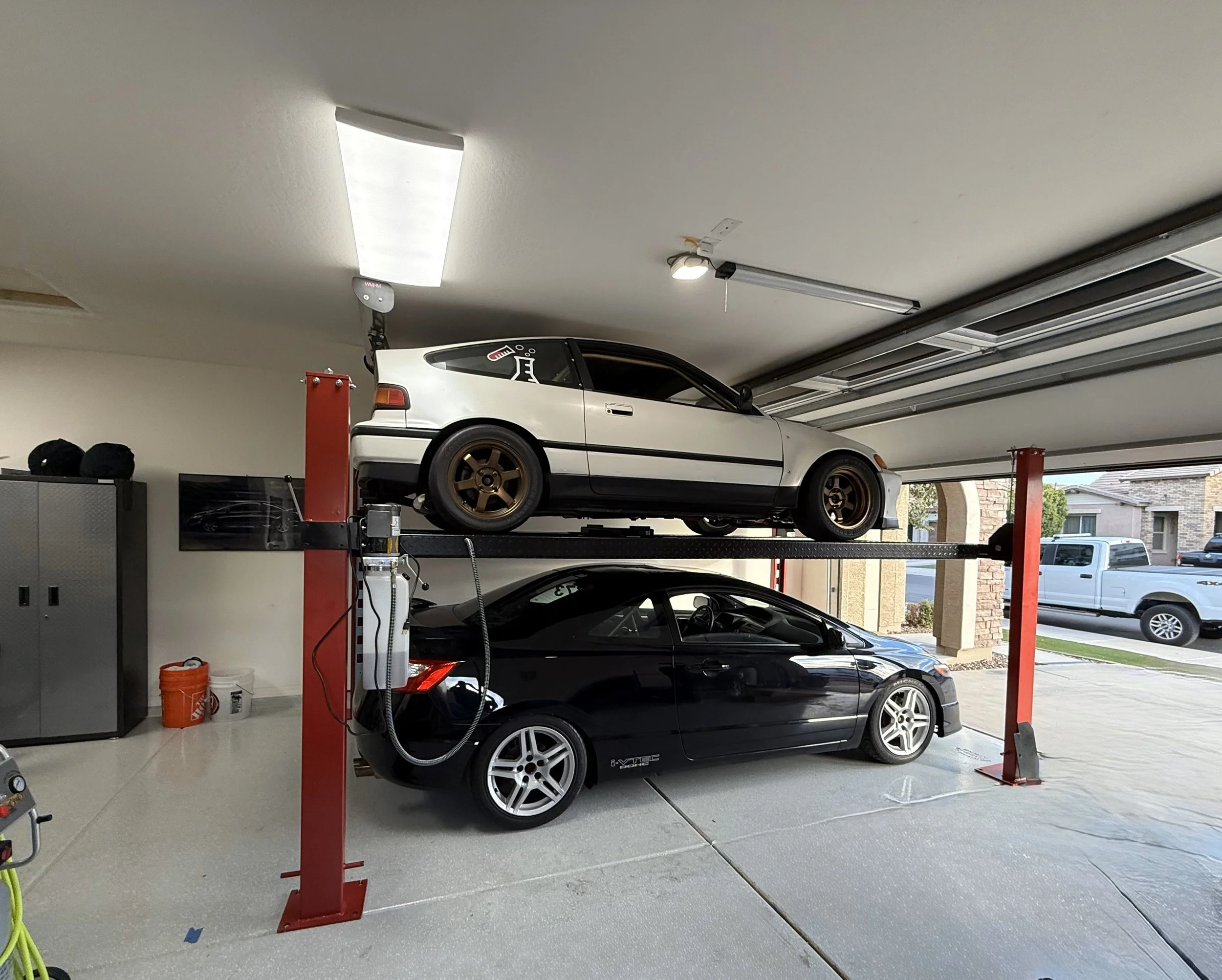 The Quatro Stacker Standard is an ALI-certified four-post lift designed for residential use, providing the perfect solution for storage, parking, and vehicle servicing at home. It has an 8,000 lb. lifting capacity, accommodating small trucks, SUVs, and various cars. The 8K Standard is the best fit for when you need maximum lift in the smallest footprint.